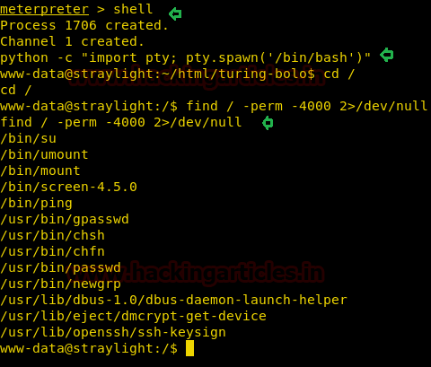 Per the above output, it has dumped all system binaries having SUID permissions; however /bin/screen-4.5.0 seems to be interesting. Therefore first let us begin escalating the root privileges