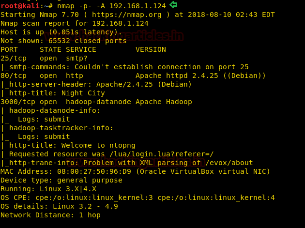 The NMAP output shows us that there are 3 ports opened: 25 (SMTP), 80 (HTTP), 3000