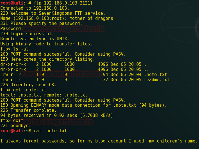 ftp 192.168.0.103 21211 ls –al get .note.txt exit cat .note.txt