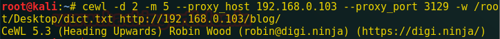 cewl -d 2 -m 5 --proxy_host 192.168.0.103 --proxy_port 3129 -w /root/Desktop/dict.txt http://192.168.0.103/blog/