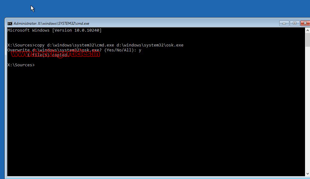 Then you’ll copy the command prompt executable (cmd.exe) over top of the On Screen keyboard executable