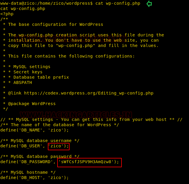 To simulate a proper shell with TTY we use python one-liner. Once at the shell, we find ‘wp-config.php’ file inside “/home/zico/wordpress”.