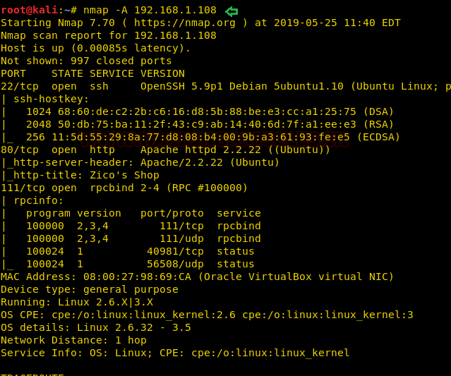 Time to scan the Target’s IP with Nmap. The scan result shows port 22(ssh), port 111(rpcbind) and port 80 are open.