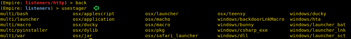 Now type ‘back’ to go back from the listener interface so that we can execute our modules. Use the following command to see all the modules that the empire provides: