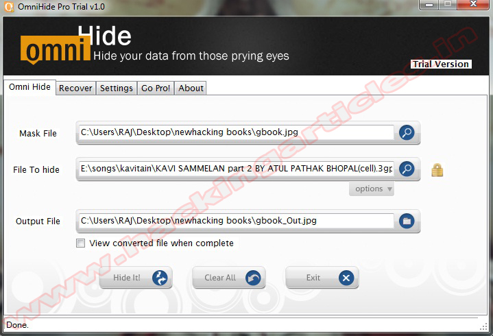 OmhiHide PRO is a powerful data-hiding utility that allows you to hide files within other files. You can use or share the output files like a normal file without anyone ever knowing of the file hidden within it. That way, your data totally stays safe from prying eyes you want to hide it from.