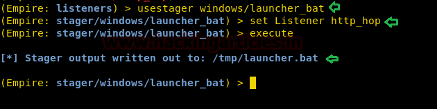 Similar to Metasploit, the hop listener in Empire uses a hop.php file. When you activate the hop listener, it will generate three PHP files that will redirect your existing listener. Place the said files in your jump server (Ubuntu) and then set up your stager in according to get the session through the mediator, i.e., our hop listener.