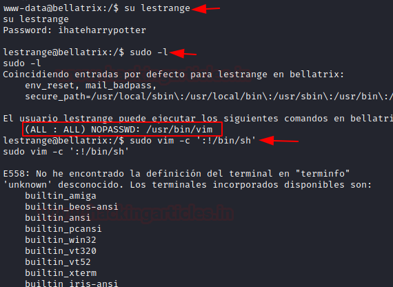 Since the password was “ihateharrypotter” for the user lestrange thus I switched the account and looked for sudo rights for him.