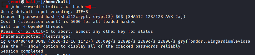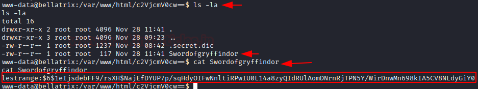 .secret.dic was a hidden file that contains wordlist and Swordofgryffindor stores hash for the user “lestrange“