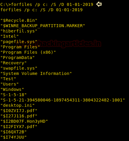 In a scenario where we want to list the files with their path and when they were modified recently, we can use this command. Here we are using the date switch to define the number of days. We can change the number of days with /D to our requirement. Then we specified the extension .exe this can be any extension we want to search. And then finally we used the @fdate to make the date it was modified listed in the output.