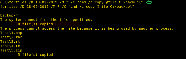 In a scenario where we want to take a backup or copy all the files that were modified on a particular date, we can use this forfiles command. Here we are using the date switch to define the number of days. We can change the number of days with /D to our requirement. Here we need to keep in mind that we need to first create the folder where we want to take backup otherwise, this command won’t get executed properly.