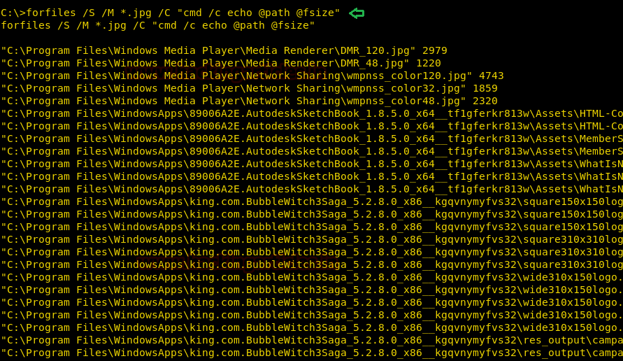 In a scenario where we want to list image files with their path and size which were modified recently, we can use this command. Here we are using the @fsize extension to display the size of the files in bytes. We specified the extension .jpg this can be any extension we want to search. And then finally we used the @path to make the complete path listed in the output using forfiles command.