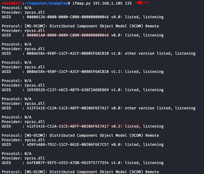 Initially, Ifmap scripts bind to the MGMT interface of the target machine. Subsequently, they fetch a list of interface IDs and add those IDs to another extensive list of UUIDs already present in their database. After that, the script attempts to bind to each interface and reports the interface’s status—typically as either listed or listening. Notably, its ability to gather detailed information is unmatched. Furthermore, a Metasploit module that functions similarly to this script is auxiliary/scanner/dcerpc/endpoint_mapper. The retrieved list of UUIDs (Universal Unique Identifiers) corresponds to various services mapped by the endpoint mapper. Consequently, after identifying these services, an attacker can search online to determine if any are vulnerable to buffer overflow attacks over RPC.