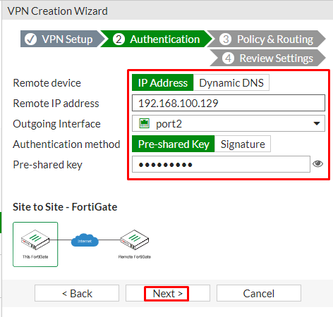 Set a secure Pre-shared key that is used to connect and verification for both FortiGates.