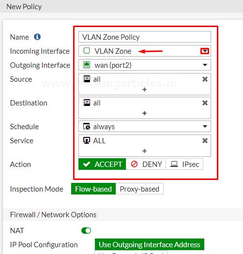 Assign a name to “VLAN Zone Policy” make it identifiable, set the Incoming interface to your Zone and the outgoing interface to the internet-facing interface. configure the rest as needed or as per your requirement.