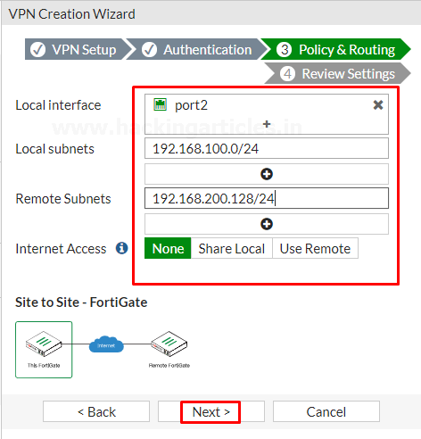 In the section of Policy and Routing, you set the Local interface to “LAN”; in my case, I dedicate “Port2” to the LAN, and local subnets automatically add further. Then, you set “Remote Subnets” to the HQ (Headquarter) network and set internet access to “None,” as shown below.