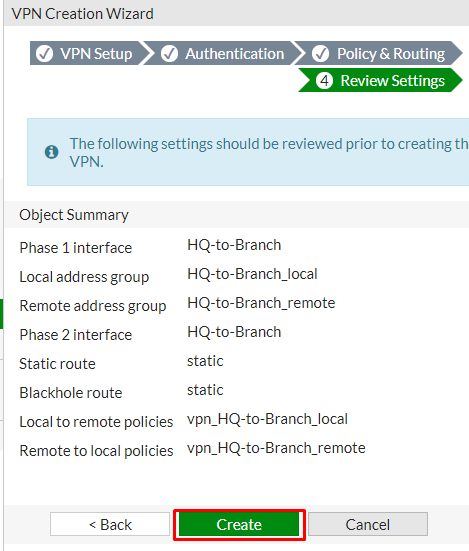Review the configuration summary that you configured that shows the interfaces, firewall addresses, routes, and policies after verifying it select create icon