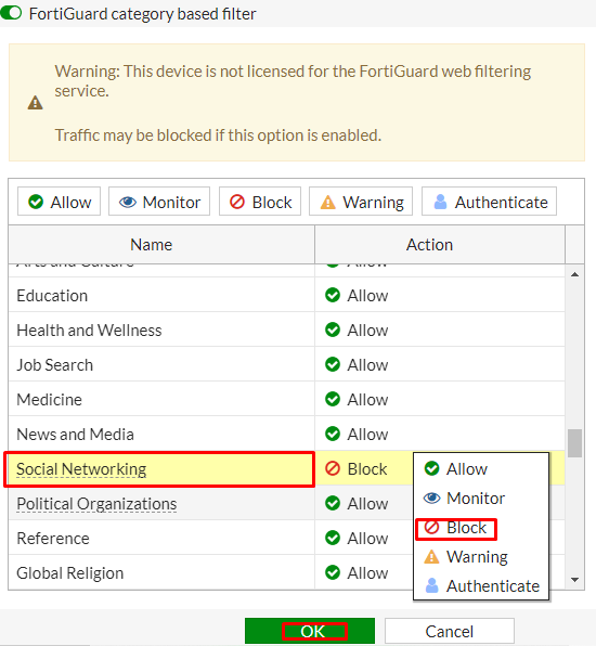 Right-click on General interest FortiGuard category. Scroll down to Social networking subcategory and select action to “Block” as shown below.