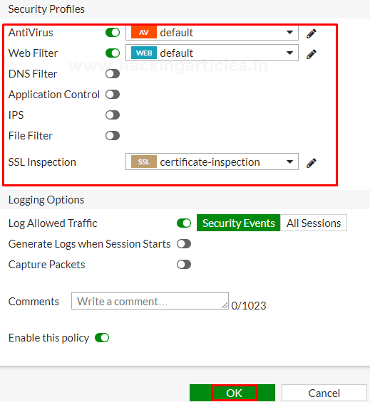 Scroll down to Security profiles enable Web Filter and select default web filter profile and save the configuration.