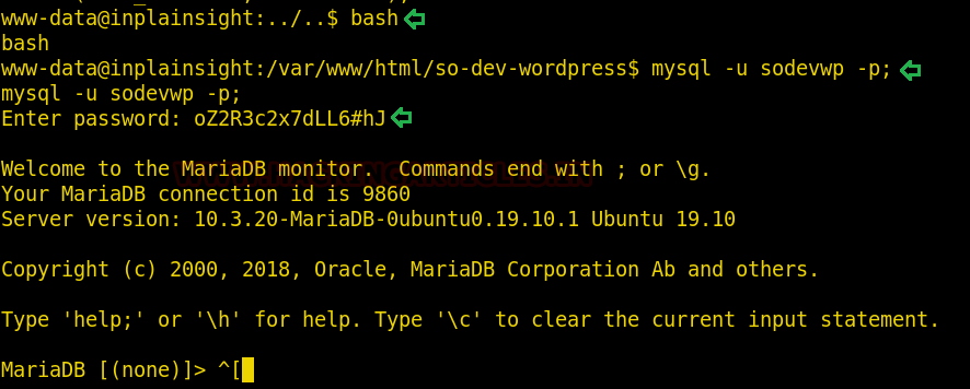 Upon changing the directory, we found wp-config.php. as it is a config file, there’s bound to be useful information. Thus, we will try to read it’s content using the cat command :