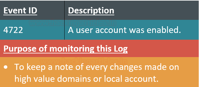 Subsequently, after you enable a new user account, the system generates event 4722, along with the account name.
