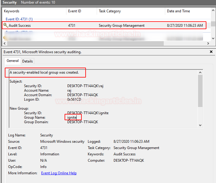Furthermore, when you create a new security-enabled local group, you can see that the system generates this event in the Event Viewer along with its name.