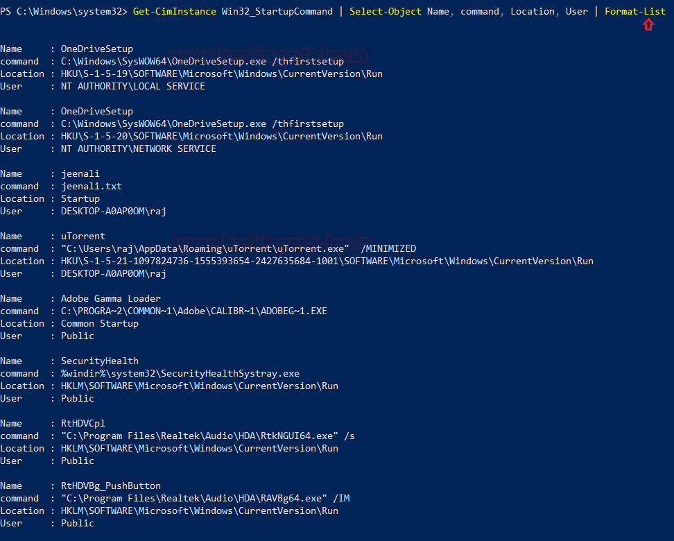 Get-CimInstance Win32_StartupCommand | Select-Object Name, command, Location, User | Format-List