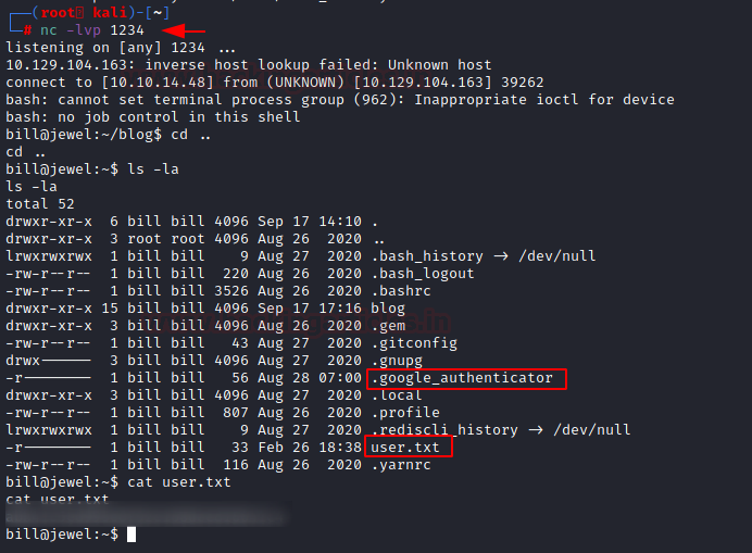 In a few moments, we see that we have a shell of the user bill. We start our enumeration of the user flag and found it inside the home directory of bill user. We read the user flag.