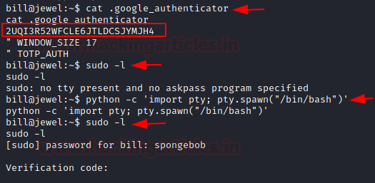 Now we see that a hidden file by the name of .google_authenticator. This seems interesting. We read it to find a code inside of it. Holding the thought for the authenticator code, we decided to run the sudo -l to enumerate the binaries that we can execute with elevated privileges. It asks us for the password of user bill. We cracked that earlier. We enter spongebob as bill’s password. Then it asks us for a verification code. This means that google authenticator is not a rabbit hole. We need to setup an authenticator using the code provided to us.