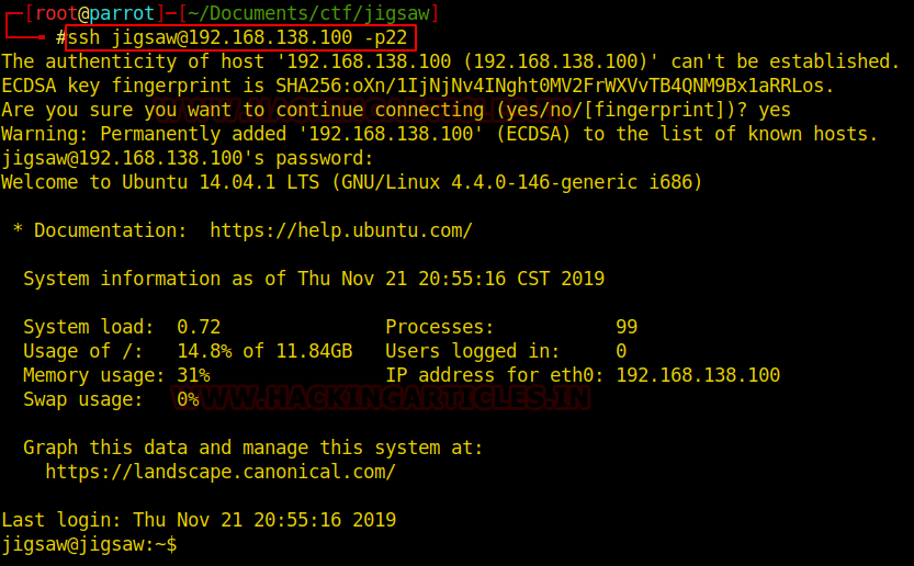ssh jigsaw@192.168.138.100 -p22 password: j19s4w