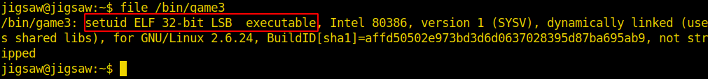 The search for SUID executables brought us a very interesting binary: “/bin/game3”.
