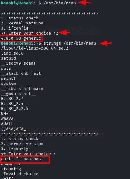 We ran the menu binary to see that it prints a menu with options such as status check, kernel version, and running ifconfig. We ran the kernel version and got version 4.80. Apparently, this binary must be running the command in the background to get these outputs. To understand better, we used the strings command to fetch all the human-readable snippets from the binary, and eventually, we found that it uses the curl command to get the localhost. Since it doesn’t mention the full path of curl, we can therefore create a malicious payload with the name curl and add it into the path. This will make the binary run our malicious file instead of the original curl.