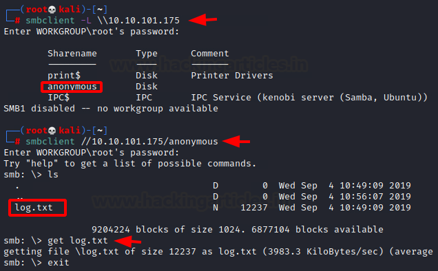 To enumerate the SMB service, we will use the smbclient with the IP address of the target machine as shown in the image. We can see that there is a share by the name of anonymous. Upon accessing the share, we find a text file by the name of log.txt. We transfer the log file to our Kali machine to take a better look at it.