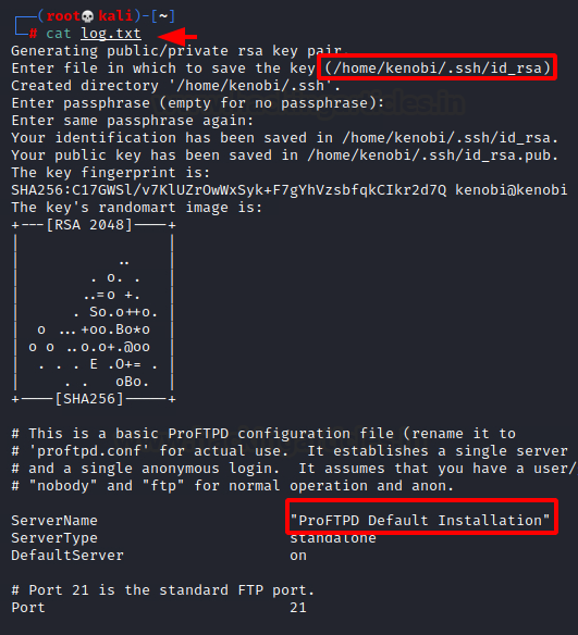 Reading the log, we can see that it contains the path for the id_rsa key stored on the target machine. Also, it points to the fact that the FTP service running on the target machine is ProFTPD.